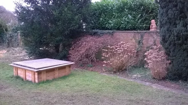 Garten vom Haus aus gesehen, das Gerätehaus ist in voller Breitseite zu sehen. Es wird zur Schmalseite gedreht und Richtung Mauer hinter eine Eibe verschoben.