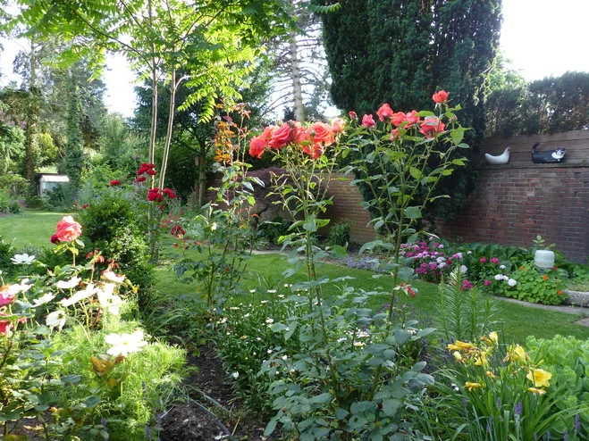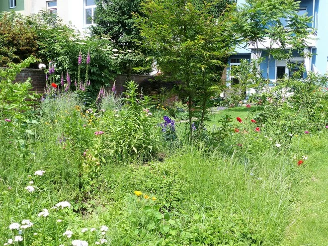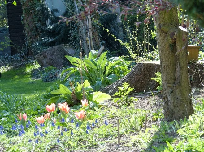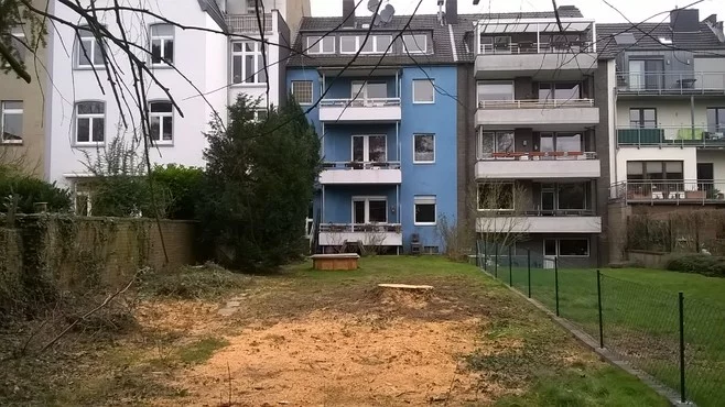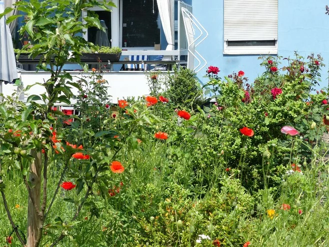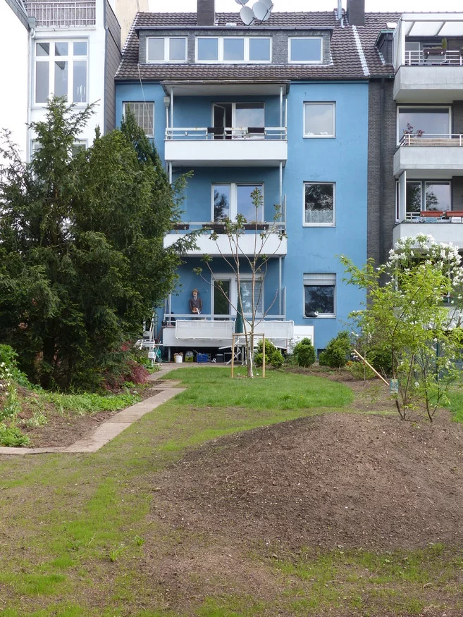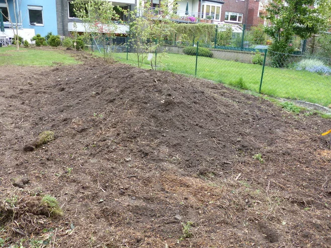 Der Hügel wird mit einer vorwiegend einjährigen Mischung als Bienweide eingesät. Um den unbegrünten Nachbarzaun zu verdecken sind ein Apfel Buschbaum, eine Zierquitte, eine Zierapfel und eine Zierkirsche sowie ein Pflaumen Halbstamm gepflanzt. In Gartenmitte ersetzt ein Beamtenbaum >kommt spät und geht früh< einen Sonnenschirm.