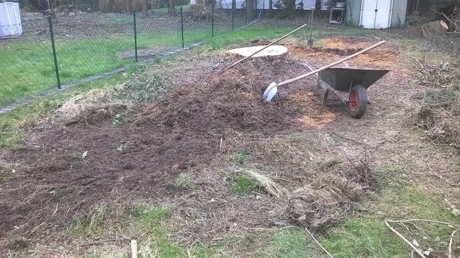 Auf dem ehemaligen Standort der Gartenhütte gedeihen die beiden Rhododenron aus dem Vorgarten dank Bodenverbesserung prächtig.