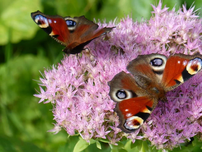 8 (acht) Tagpfauenauge auf einer Fetthenne (Sedum telephium)