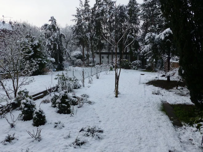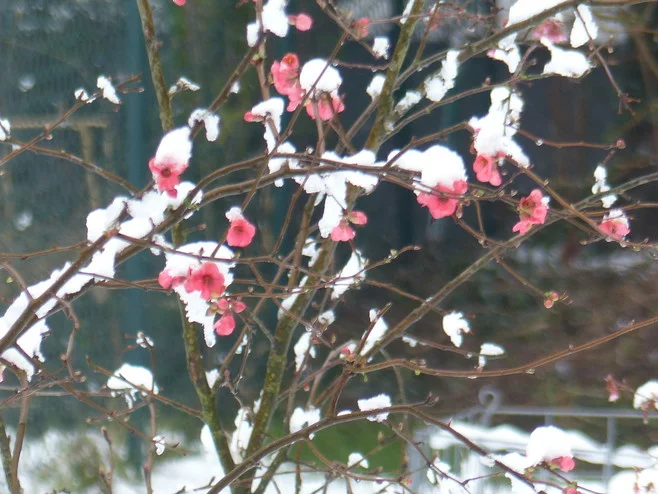 Die Zierkirsche hat sich am 7. März 2016 mit den Blüten zu früh hervorgewagt.